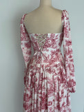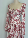 Elegance meets timeless charm in this vintage-inspired midi dress, featuring a romantic red-and-white toile de Jouy print. The dress showcases a flattering square neckline, accentuated by a delicate 3D floral applique at the bust for a touch of femininity. With long puffed sleeves and a defined waistline, this piece creates a beautifully cinched silhouette before flowing into a full, gathered skirt.