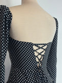 Mon Amour captures the spirit of timeless elegance with a contemporary twist. Crafted from a soft, flowing fabric adorned with classic white polka dots, this piece evokes effortless sophistication reminiscent of vintage Parisian style. The sweetheart neckline and delicate back lacing create a perfectly sculpted silhouette that flatters every curve, while the long puffed sleeves add a touch of romantic drama.