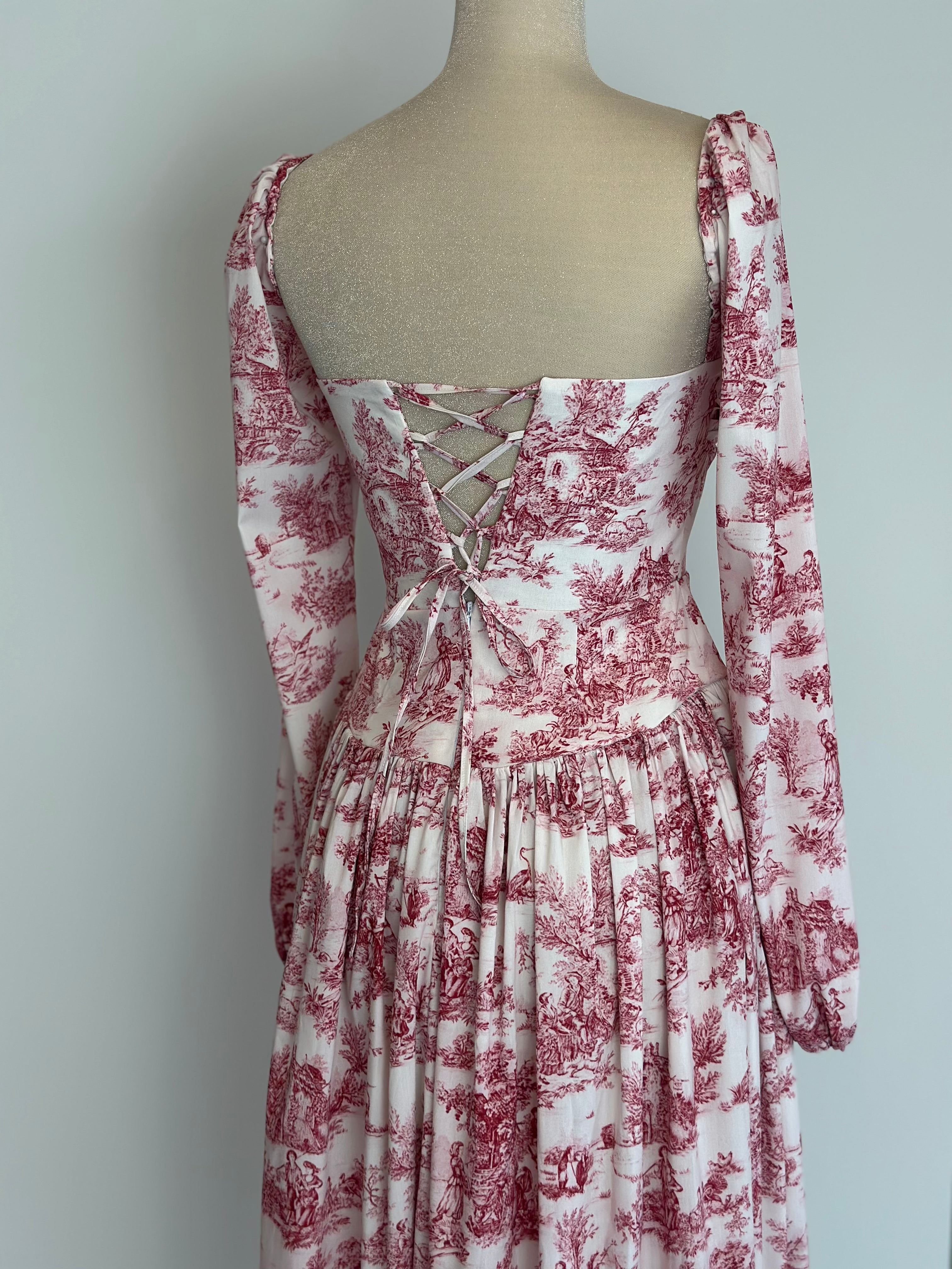 Elegance meets timeless charm in this vintage-inspired midi dress, featuring a romantic red-and-white toile de Jouy print. The dress showcases a flattering square neckline, accentuated by a delicate 3D floral applique at the bust for a touch of femininity. With long puffed sleeves and a defined waistline, this piece creates a beautifully cinched silhouette before flowing into a full, gathered skirt.